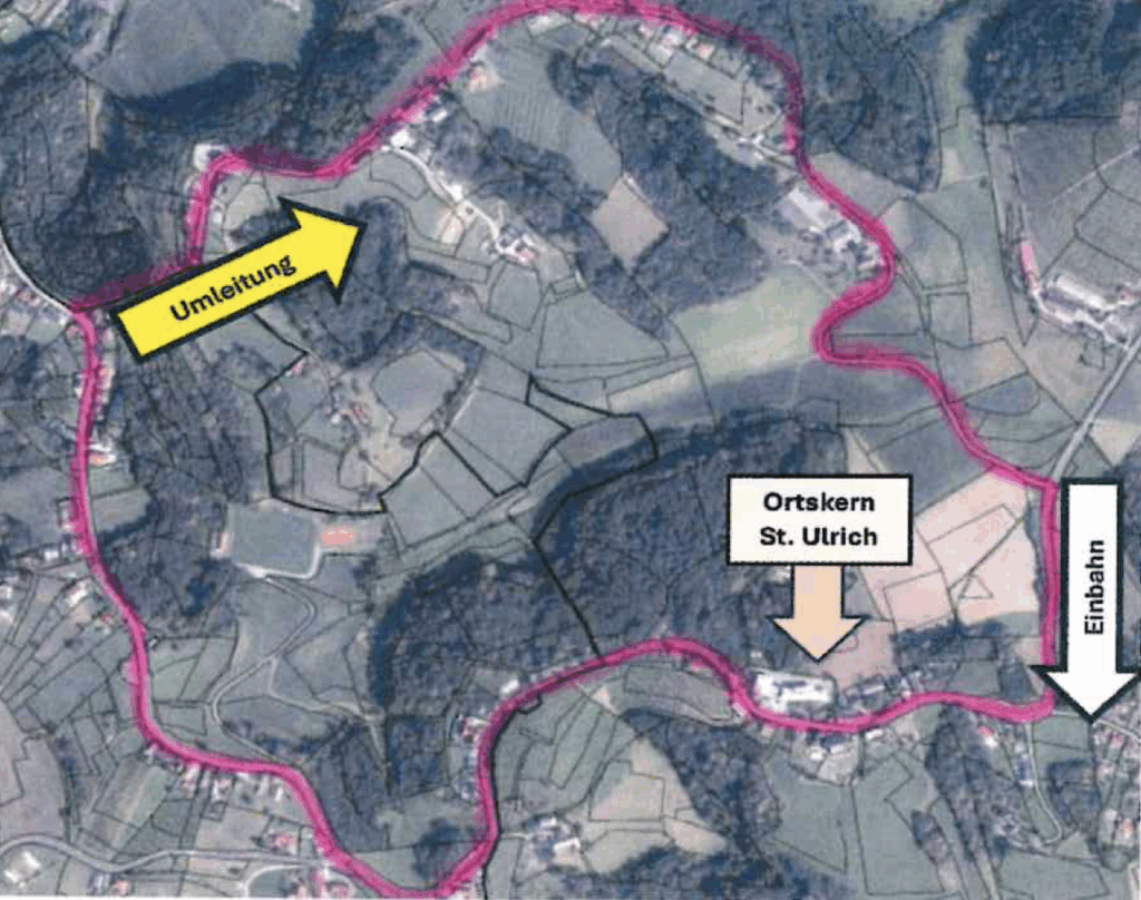 „Aufgrund der geringen Parkplatzmöglichkeiten bei größeren Veranstaltungen im Ortskern St. Ulrich, gilt bei solchen ein Einbahnsystem, dass während der Veranstaltungszeit bitte einzuhalten ist. Die Zufahrt zum Ortskern erfolgt über eine Einbahnregelung über die Landesstraße L654 kommend, von Gasselsdorf. Für die, die über Eibiswald oder Pölfing-Brunn kommen, ist eine Umleitung zur Veranstaltung über die Gemeindestraße Felsberg eingerichtet. Zufahrt zur Kreuzung Neuwirth ist von beiden Fahrtrichtungen möglich! Dies ist die günstigste Variante um möglichst viele Parkplätze zu schaffen. Wir danken für das Verständnis!“